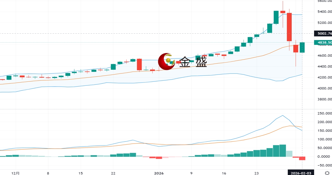 现货黄金周一(2月2日)亚市早间开盘于4833.89美元/盎司,最高4884.11美元/盎司,最低4403.02美元/盎司,收盘4619.25美元/盎司,全天波幅约481美金,当日跌幅约4.29%。