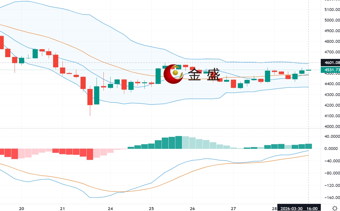 从四小时图来看,现货黄金上一交易日多头再度发力,重返4500美元上方,最终震荡收涨。今日黄金早间开盘跳空低开,盘中最低触及4420后就开启拉升,在欧盟前再度测试4550附近压力,短期反弹动能强劲,中期空头趋势有所缓解,但尚未完全反转。布林带收口,价格运行在布林带中上轨之间,多头趋势明显,但上轨压制作用逐步显现。在未突破关键阻力区间前,短期空头仍占据主导。操作上维持高空低多交易思路,上方重点关注4580-4600区间阻力,下方关注4500-4470区间支撑。