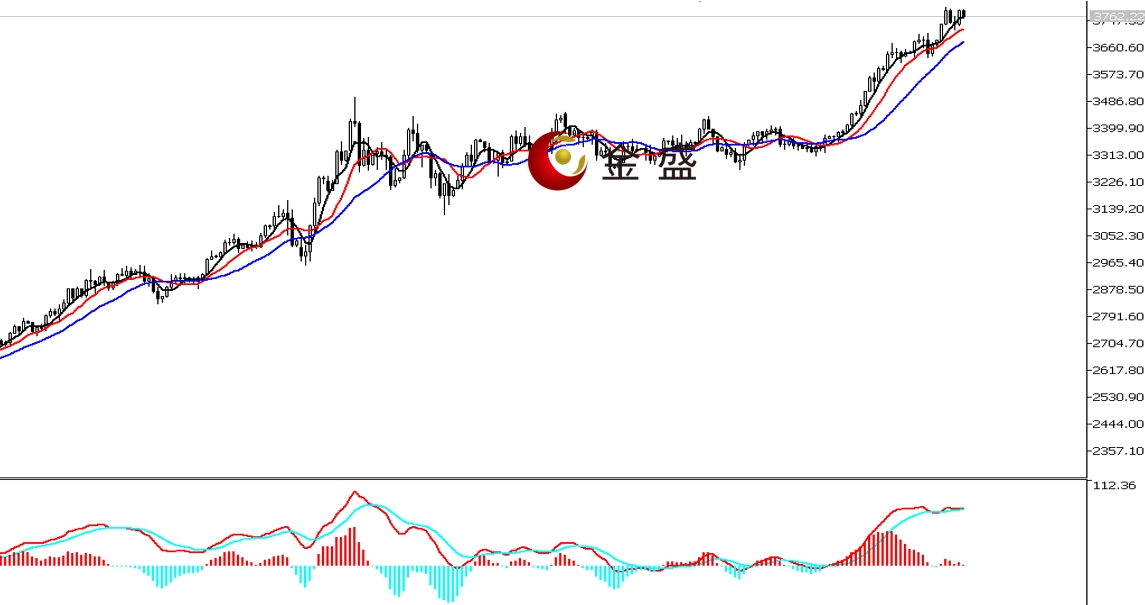 周线图,黄金继续上涨,价格逼近3800美元关口,当周波动逾一百美金,周线收中阳线。均线系统向上拐头,运行在价格下方形成支撑。MACD指标快慢线零轴上方运行,做多的动能有增强的迹象。黄金连续六周上涨,且本周的阳线实体大于前两周,即市场多头势能未能持续减缓。随着价格突破3700美元大关,市场做多热情有所升温。后市偏向还有高点,操作上调整做多为主。