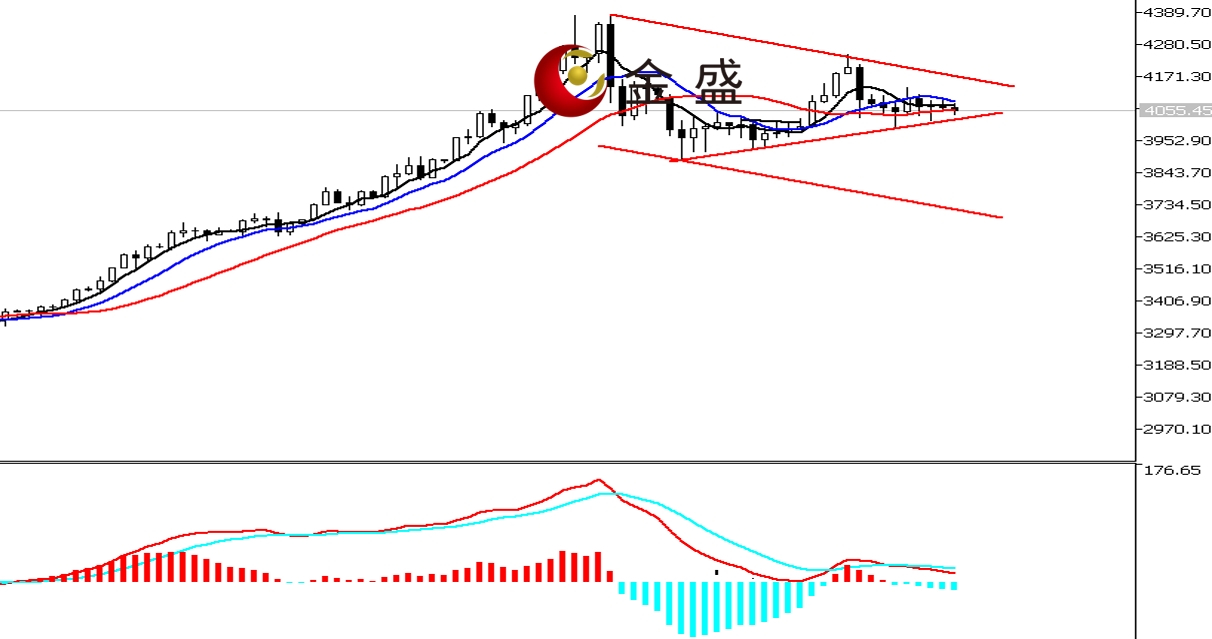 日线图,周内走势先跌后涨走V字型,价格承压4100美元关口震荡,连续多日的K线出现长影线。均线系统不断收敛,价格围绕其震荡。MACD指标快慢线零轴上方走平,做空的动能增强。黄金中长期上行趋势不变,当前进入高位震荡。走势形成图示的下行通道。本周多次承压4100美元一带,此处是向上打开反弹空间的关键压力位。多头自3890附近开始的反弹走势还未被终结,形态图示三角形结构的下轨。短期关注4000—4100区间如何突破。操作上反弹做空为主。