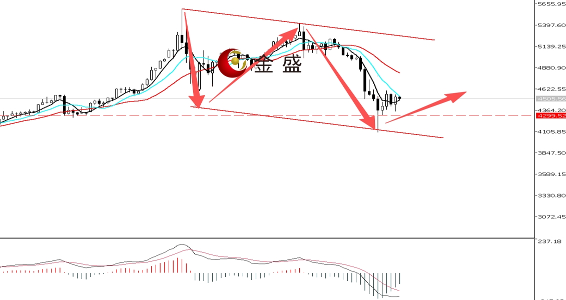 日线图,周一亚太股市暴跌,市场因流动性不足而出现恐慌情绪,黄金白盘大幅下挫至创年内新低,晚盘收复日内大部分跌幅。随后连续两日反扑至4600美元一带。后半周行情以震荡为主。均线系统收敛向下拐头,对价格反弹形成阻碍。MACD指标零轴上方现死叉,做空的动能减弱。黄金自5600美元一带开始的调整形成下行结构。本周回踩通道下轨强势反扑,周内形成V型反转,即确认4300美元下方支撑强劲。本周虽以反弹为主,但价格上行空间有限,即在地缘局势不明朗的情况,多头入场意愿不强。行情或继续弱势休整蓄势,操作上等待二次回踩4300附近的博多机会。