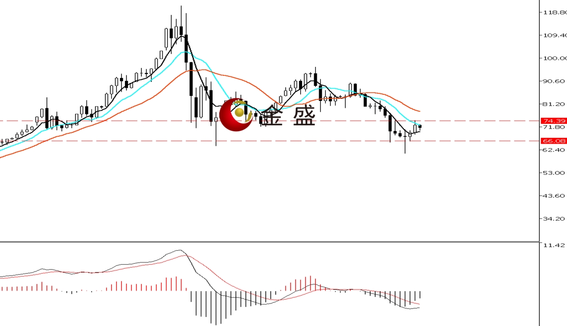 前一个交易日,白银依托69美元关口震荡上行,在亚盘持续阳线拉升至当日高点74.51美元,随后技术性调整。晚盘时段,行情围绕不足两美金的空间盘整,价格运行在71美元上方,最终收有上影线的阳K。均线系统收敛向下拐头,十周期均线压制价格反弹。MACD指标快慢线零轴附近现死叉,做空的动能减弱。白银连续三日反抽,昨日上行受阻有回落,反弹时间和空间都接近转折点,即行情可能要进入超跌反弹后的盘整,操作上高抛低吸。