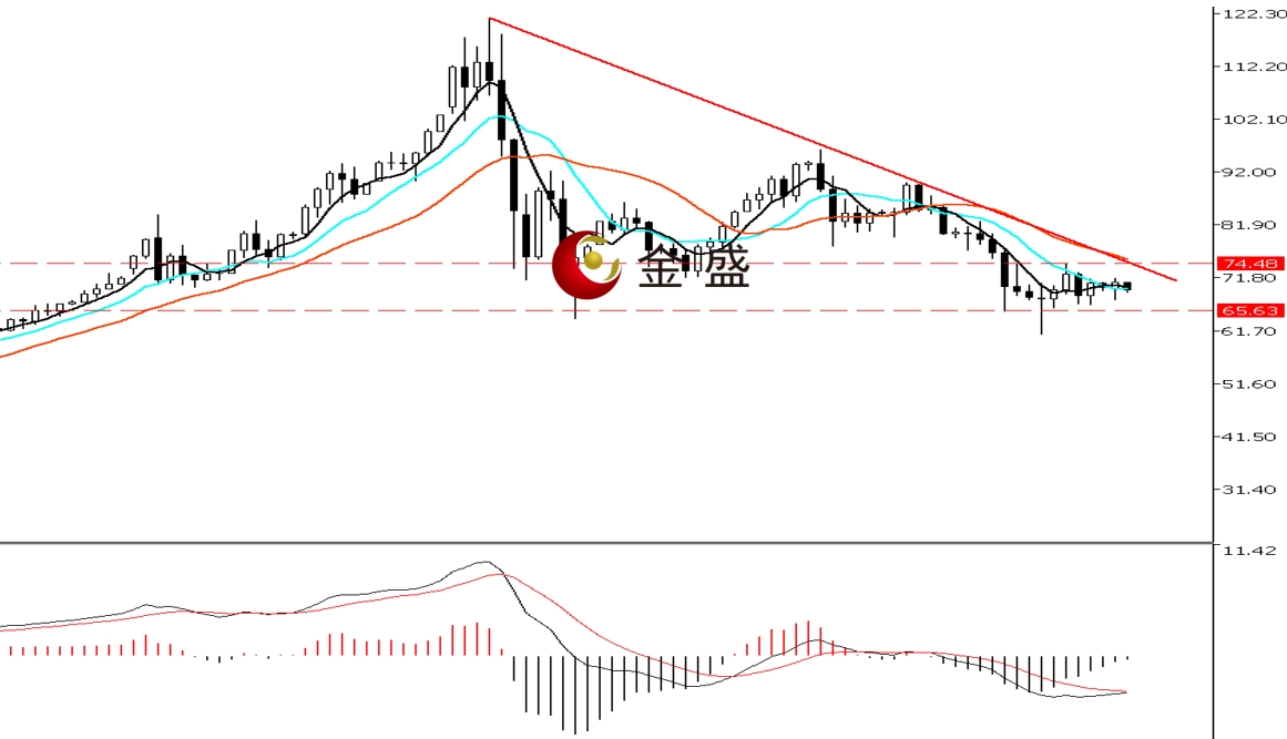 前一个交易日,白盘时段,银价低开低走短暂下挫至日内低点67.63美元,随后连阳反抽关闭缺口突破70美元大关。晚盘时段,白银涨势减缓,价格上冲至71.7美元转跌,最终收阳线。均线系统收敛不断收敛,布林带中轨压制价格反弹。MACD指标快慢线零轴下方运行,做空的动能减弱。白银自121美元一带开始的调整形成下行结构,价格运行在图示的趋势线下方,多空分水岭在75美元附近。近期行情进入区间横盘整理,小级别价格高低点有上移的迹象,可能是多头转强的信号,操作上高抛低吸。