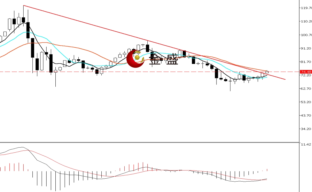 前一个交易日,白盘时段,银价探底至69美元一带止跌回升,早盘一小时拉升三美金。午后运作在70美元上方横盘整理。晚盘时段,行情延续涨势,价格创当日高点74.13美元,日图收阳线。均线系统收敛不断收敛,布林带中轨压制价格反弹。MACD指标快慢线零轴下方运行,做多的动能为主。白银自121美元一带开始的调整形成下行结构,今天早盘行情继续上涨,价格走出图示下行压力线。短期关注价格能否有效站稳75美元关口,一旦确认,则后市反弹空间打开,操作上低吸为主。