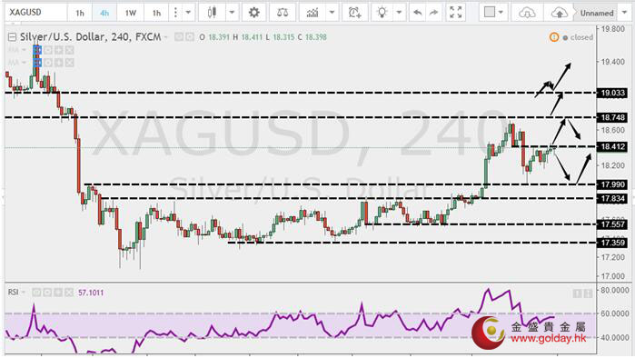 国际现货白银上周五(11月4日)亚盘和欧盘和黄金一样,小幅回落后再度拉升,不过较黄金而言,力度偏弱,美盘维持小幅震荡,无明显波动。上方依然关注能否上破18.45和18.75两线,突破看19整数关口,突破不了可以反抽做短空,下方关注18.00美元/盎司支撑,回落获得支撑可以做多。
