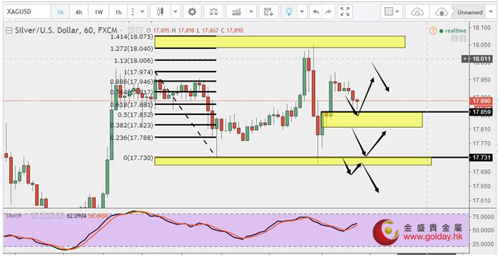 现货白银周二(2月14日)亚盘和欧盘逐渐震荡上行,美盘受到基本面影响急跌急涨。上方关注昨晚高位附近的阻力,在昨日急跌的起点还是有部分空单应该是没消耗完的。下方关注17.80-17.85和17.73美元/盎司的支撑,回落获得支撑可以做多,以目前的情况,只有下破17.73美元/盎司才能认为白银转为空头。