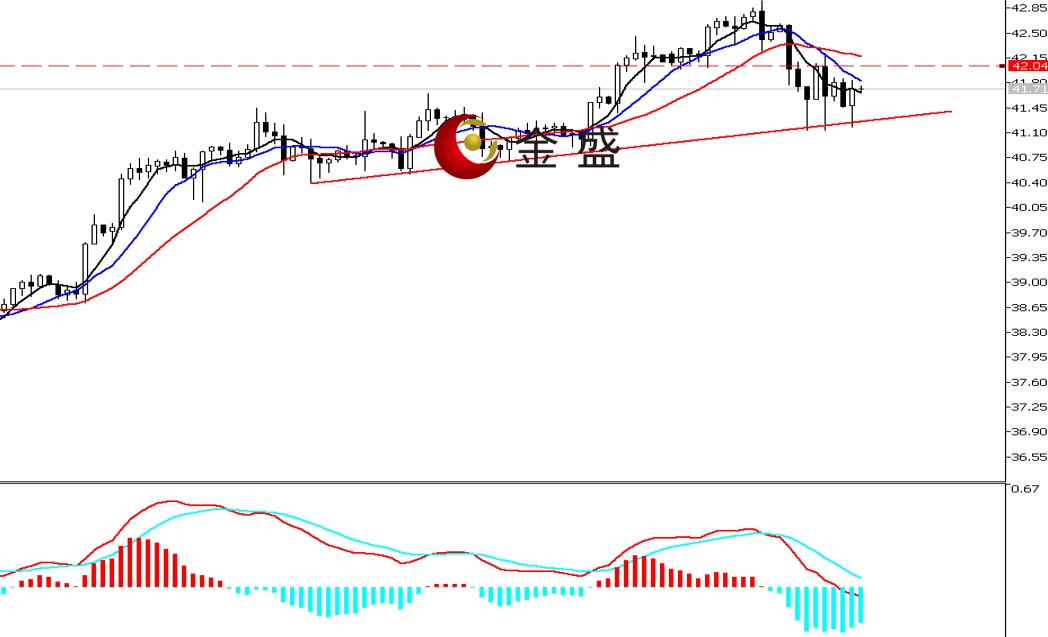 前一个交易日,白银多头表现偏弱,价格早盘出现跳水走势,利率决议落地后,行情再次下挫,但并未跌破日内低点41美元一带,可见此关口的支撑很强,最终收跌2.01%。今天白盘行情延续昨日区间内整理,价格先跌后涨走V字型。四小时周期,均线系统收敛向下拐头,对价格上涨形成阻碍。MACD指标快慢线零轴上方现死叉,做空的动能增强。白银上涨趋势不变,但回调空间加大,走势偏向进入调整阶段。昨日低点正好落在图示的支撑线上,42美元一带是利率决议公布后的起跌点。短期看41—42区间震荡,操作上高抛为主。