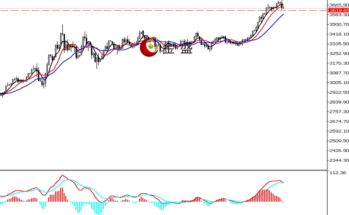 前一个交易日,白盘时段,黄金早盘反弹乏力延续调整,午后市场波动加剧,多头一小时反扑逾二十美金,价格创日内高点3672.74美元。晚盘时段,行情再度转跌,一小时下挫近四十美金,价格创日内低点3627.89美元,最终再收阴线。均线系统多头排列,价格跌破短期均线。MACD指标快慢线零轴上方现死叉,做空的动能增强,出现顶背离信号。黄金延续调整,连续两日收阴。3670美元一带出现连续承压,此处是第一压力位。下方强支撑看3620美元一带,操作上高抛低吸。