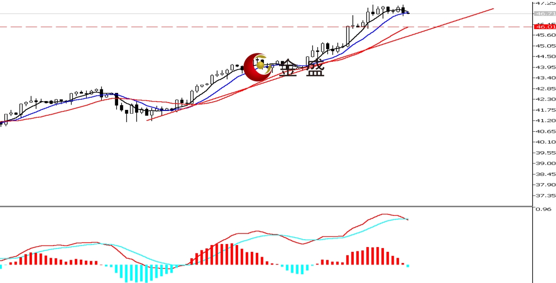 前一个交易日,白银延续上行,价格在早盘大幅走高至47美元关口,午后以震荡为主,最终收涨1.84%。今天早盘行情延续昨日区间盘整,午后跌破区间扩大日内跌幅。四小时周期,均线系统多头排列,运行在价格下方形成支撑。MACD指标快慢线零轴上方现死叉,做空的动能增强。白银上涨趋势不变,日图完成三连阳。近期走势形成图示的加速上涨支撑线,46美元关口是强支撑区。操作上调整做多为主。