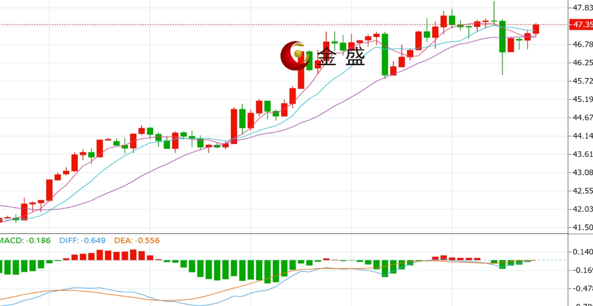 前一个交易日,白银走势与黄金同步,价格先涨后跌走倒V字型,盘中继续新高至48美元一带,随后下跌2美金,尾盘有所反弹,最终收跌0.7%。今天白盘行情延续反抽,多头收复昨日大部分跌幅。小时周期,均线系统多头排列,对价格上行构成支撑。MACD指标快慢线零轴下方现金叉,做多的动能为主。白银上涨趋势不变,价格刺破趋势线,表明空头势能有增强。短期看高位震荡,操作上高抛低吸。