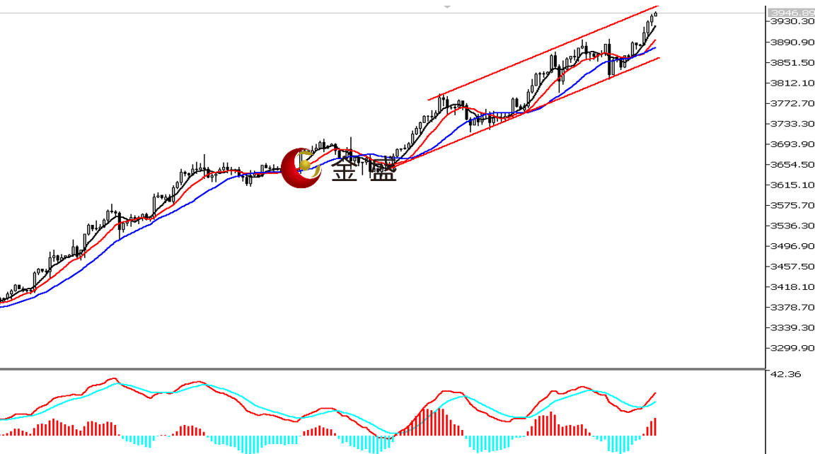 前一个交易日,美国非农报告未公布,ISM数据低于预期。美指窄幅震荡收小阴,黄金区间盘整,但价格重心不断上移,最终收涨0.79%,周线录得七连涨。今天白盘美指高开高走,黄金也是持续走高,午后日内涨幅逾1.5%。四小时周期,均线系统多头排列,对价格上行构成支撑。MACD指标快慢线零轴上方现金叉,做多的动能为主。黄金上行趋势不变,价格突破上周高点,3900美元一带形成支撑 。近期走势形成图示的上涨通道,当前价格已来到通道上轨附近,但无明显受阻迹象,操作上做多为主。