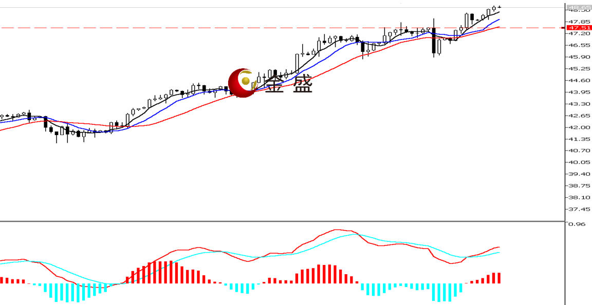前一个交易日,白银走势与黄金同步,但上行力度更强,多头接连突破47、48美元大关,盘中一度涨幅超3%,创14年新高,尾盘有所调整,最终收涨2.14%。今天白盘行情依托48美元关口延续上行,午后上涨逾1.5%。四小时周期,均线系统多头排列,价格运行在其上方。MACD指标快慢线零轴上方现金叉,做多的动能为主。白银上涨趋势不变,价格突破上周整理区间,上行空间再度打开,操作上低吸为主。