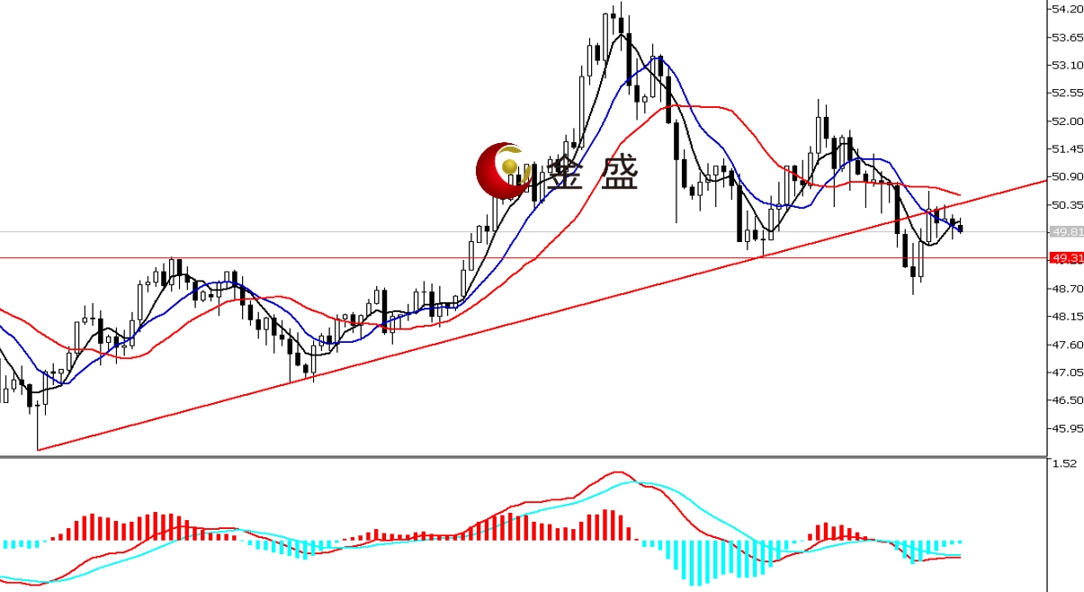前一个交易日,白银走势与黄金同步,白盘单边下挫,价格接连打破多个支撑,晚盘出现强势反抽走V型,尾盘有所回落,最终收跌1.13%。今天白盘行价格围绕50美元关口徘徊,价格重心有所下移。四小时周期,均线系统收敛向下拐头,压制价格反弹。MACD指标快慢线零轴下方运行,做空的动能减弱。白银跌破图示的上涨趋势线,表明多头力度在转弱。上周走势形成倒V字型,价格刺破49美元关口出现快速反弹,图示的水平支撑线未有效失守,可见支撑依然有效。短期盘面或有所震荡,操作上高抛为主。