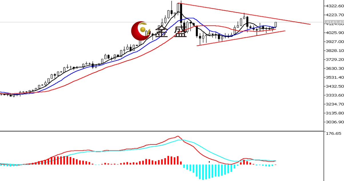 前一个交易日,白盘时段,黄金先延续调整,午后依托4040美元一带止跌转涨,收复日内全部跌幅。晚盘时段,行情继续上涨,尾盘一小时拉升四十美金,价格突破4100美元,创当日高点4139.84美元,最终收饱满中阳线。均线系统收敛不断走平,运行在价格下方形成支撑。MACD指标快慢线零轴附近有现金叉的迹象,做空的动能衰竭。黄金技术形态构成收敛三角形。昨日黄金午后单边上行,价格刷新上周高点,确认反弹升级,4100美元关口形成支撑位。后市关注结构上轨4180美元一带的压力反应,操作上高抛低吸。