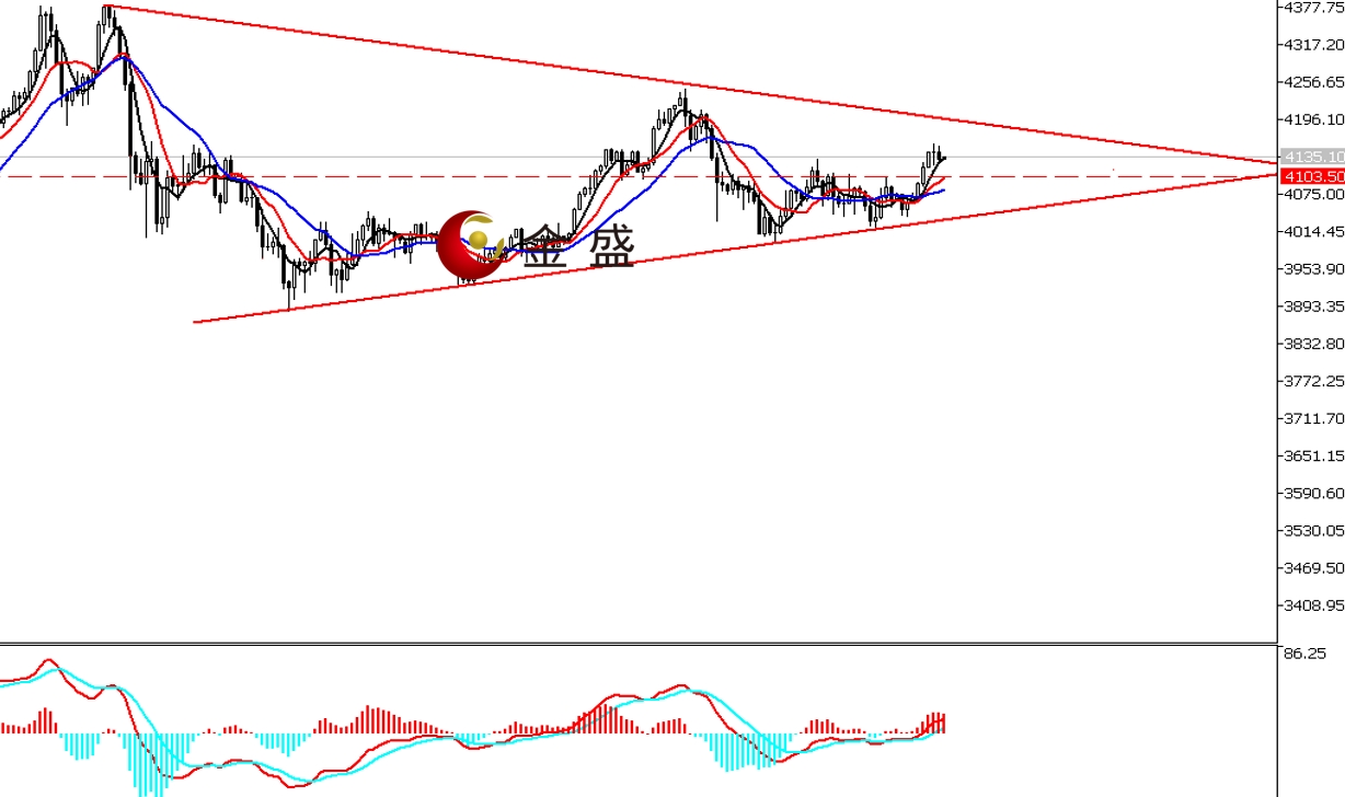 前一个交易日,美联储官员发表鸽派讲话,12月降息概率升至八成。美指高位窄幅盘整收小阳星。黄金早盘调整,午后持续反弹,晚间突破上周高点,当日波动近一百美金,最终收涨1.69%。今天白盘以休整为主,价格在4100美元上方横盘震荡。四小时周期,均线系统向上拐头,对价格上行构成支撑。MACD指标快慢线零轴附近现金叉,做多的动能增强。黄金突破上周关键压力位4100美元一带,昨日大涨逾1.5%,今天未出现明显的调整,可见整数关口形成有效突破的概率较大。行情将继续收敛三角形内震荡,后市偏向测试上轨压力,操作上回踩做多为主。