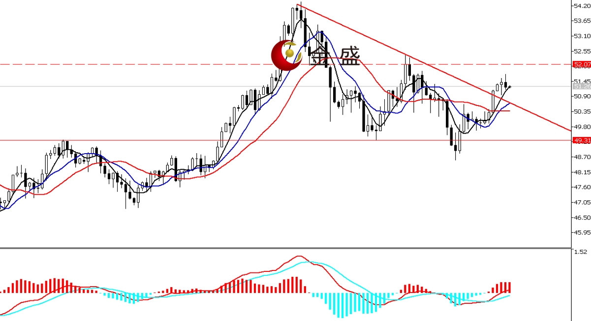 前一个交易日,银价白盘围绕50美元一带窄幅徘徊,晚盘跟随黄金大涨逾一美金,最终收涨2.64%。今天白盘行情上行减缓,价格冲高回落坚守51美元大关。四小时周期,均线系统拐头向上,支撑价格反弹。MACD指标快慢线零轴下方现金叉,做多的动能为主。白银在49.3美元一带形成双底雏形,昨日多头大幅反扑突破图示的下行趋势线,即确认自前高54.4美元一带的调整力度减缓,后市关注多空分水岭52美元一带的压力反应,操作上高抛低吸。