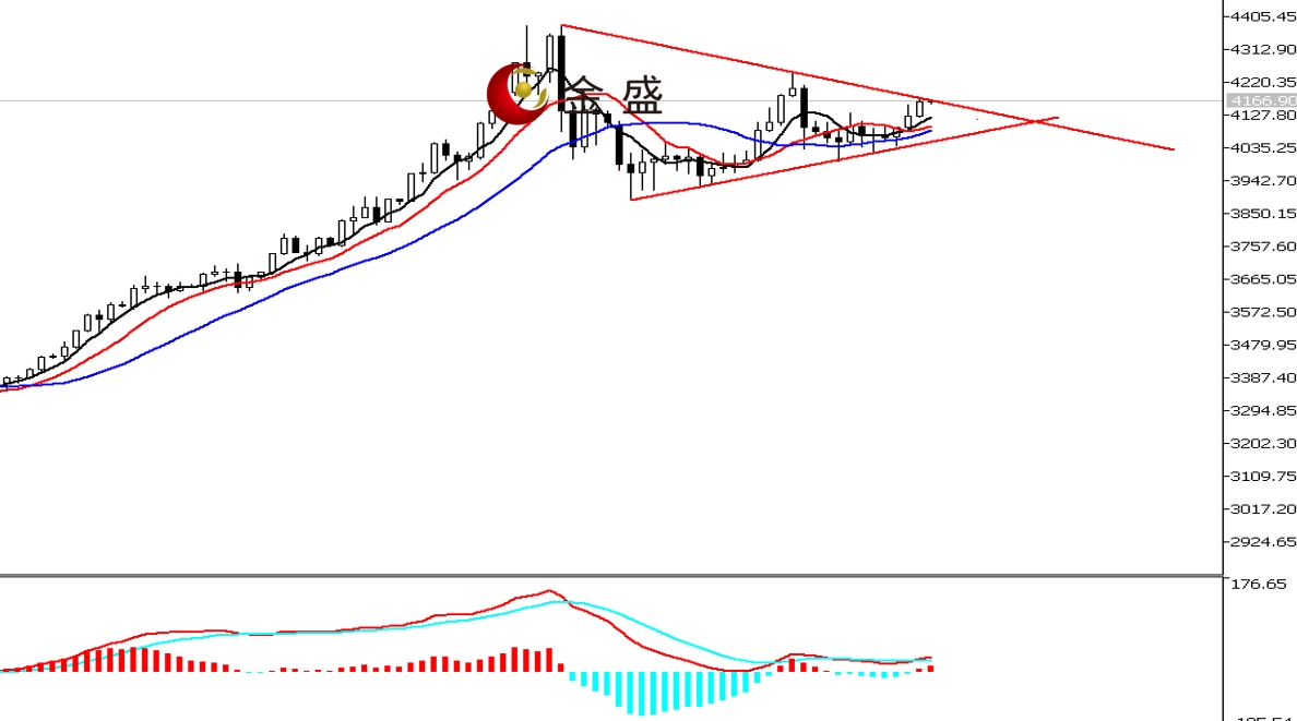 前一个交易日,白盘时段,黄金开市即创日内低点4129.63美元,随后一波连阳拉升四十美金。午盘围绕二十美金的区间休整,价格创当日高点4173.17美元。晚盘时段,行情波动加剧,价格先跌后涨走V字型,盘中一小时拉升三十美金,最终收阳线。均线系统逐渐向上拐头,运行在价格下方形成支撑。MACD指标快慢线零轴附近现金叉,做多的动能增强。黄金构成收敛三角形结构。昨日价格已经来到形态的上轨压力位附近,但K线还未出现明显的反转信号。短期依然关注这一带的得失。