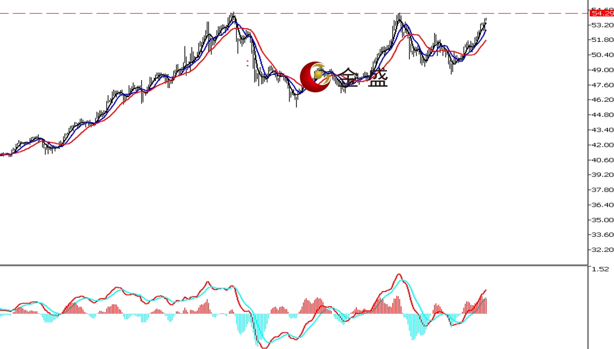 前一个交易日,白银涨势明显,价格单边上行接连突破52、53美元关口,最终收涨3.63%。今天早盘短暂调整后再度转涨,午后涨幅近1%,价格来到54美元一带。四小时周期,均线系统拐头向上,支撑价格反弹。MACD指标快慢线零轴下方现金叉,做多的动能为主。白银强势突破上周高点,价格来到前高附近。技术形态呈现两个U型结构,是看涨的技术形态。后市关注54.4美元一带的真假突破。