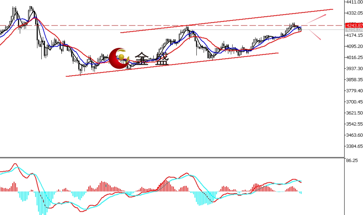 前一个交易日,美制造业PMI连续第九个月处于收缩区间,美指回踩上行趋势多空分水岭出现反抽。黄金坚守4200美元上方震荡,白盘延续涨势,晚盘基本面数据利多金价不涨反调,最终收涨0.37%。今天白盘行情延续调整,价格回踩4200美元一带有反扑。四小时周期,均线系统不断收敛,布林带中轨对价格形成支撑。MACD指标快慢线零轴上方现死叉,做空的动能为主。黄金11月形成U型走势,昨日尝试向上突破未果,多头暂时受制于4250美元一带。短期关注下方4200美元一带是否有形成有效支撑。一旦跌破此整数关口,则行情偏向对上周中阳线的技术性回踩,即调整幅度将加大。操作上回调做多为主。