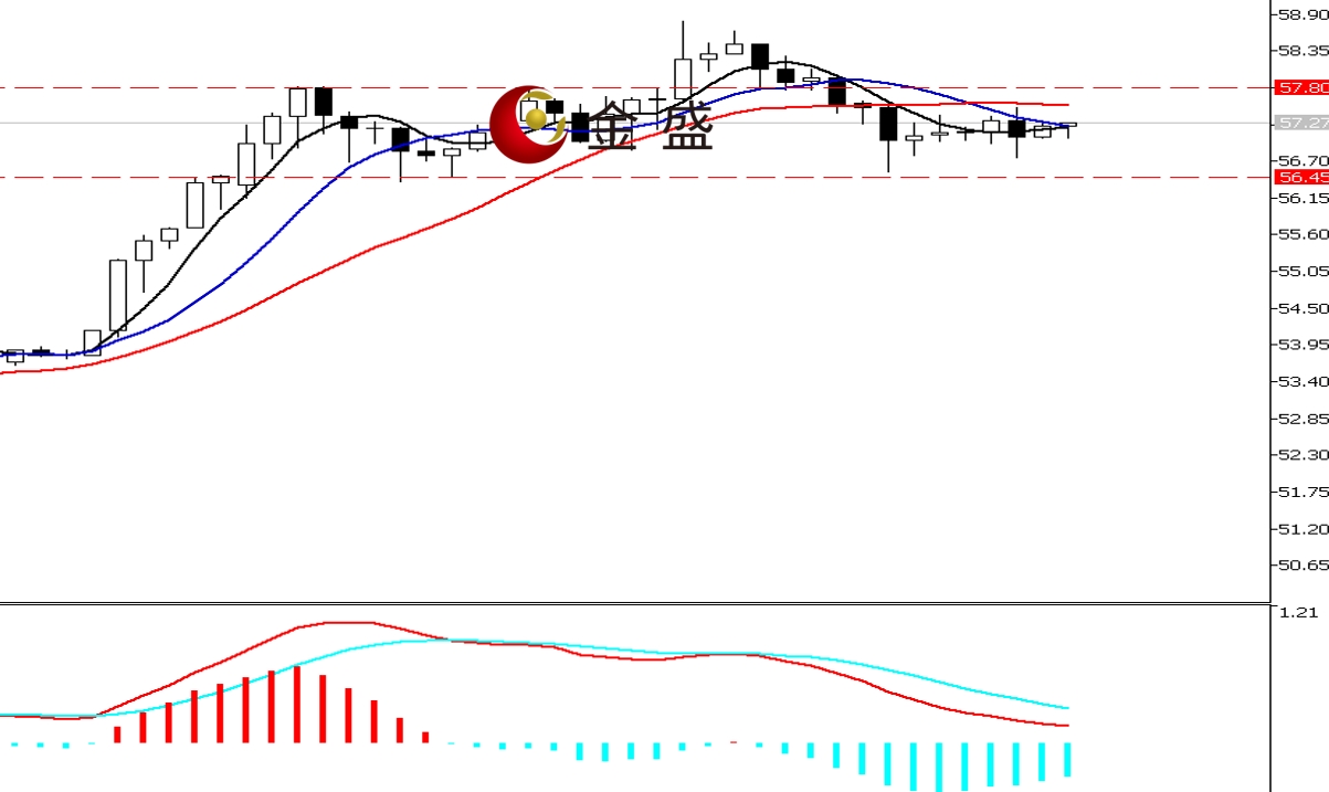 前一个交易日,白银延续强势表现,盘中一度逼近59美元大关,盘中最大涨幅逾4%,尾盘有所调整,最终收涨2.88%。今天白盘行情高位休整,早盘一度刺破57美元关口,午后横盘整理。小时周期,均线系统不断收敛,价格围绕其震荡。MACD指标快慢线零轴上方现死叉,做空的动能为主。白银近期暴涨,小周期有超买现象。今天行情高位休整,形成图示的箱体雏形,多头未跌破昨日午盘的低点,即盘口调整幅度有限,空头力度偏弱。操作低吸为主。
