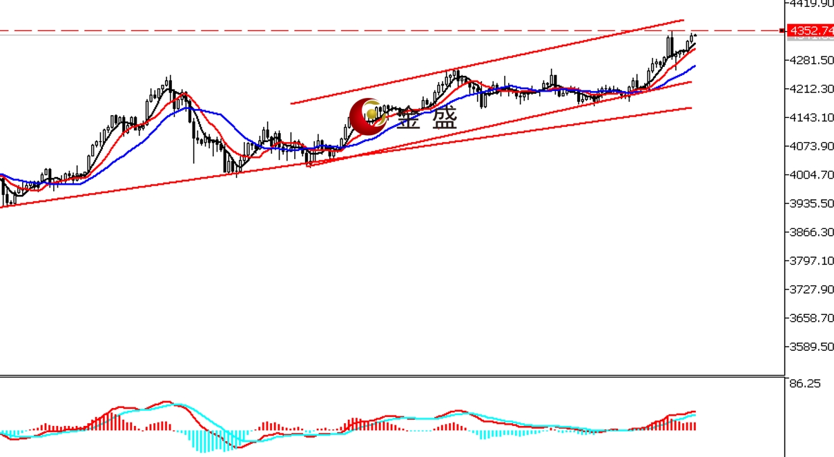 前一个交易日,美联储多位官员发表讲话,美指震荡整理收小阳星。黄金大起大落,盘中创近七周新高,但尾盘跳水跌破4300美元大关。今天白盘行情以反扑为主,多头收复上周五大部分跌幅。四小时周期,均线系统多头排列,支撑价格上行。MACD指标快慢线零轴附近现金叉,做多的动能增强。黄金自3900美元一带开始的上涨趋势延续,且行情进入加速上行阶段,走势运行在图示的通道内。上周五美盘跳水,但今天持续反扑,价格基本回到4350美元一带,短期关注这一带的得失。一旦有效站稳,则上周五的跳水属于洗盘的行为。操作上未站稳前,可以尝试博弈空单。