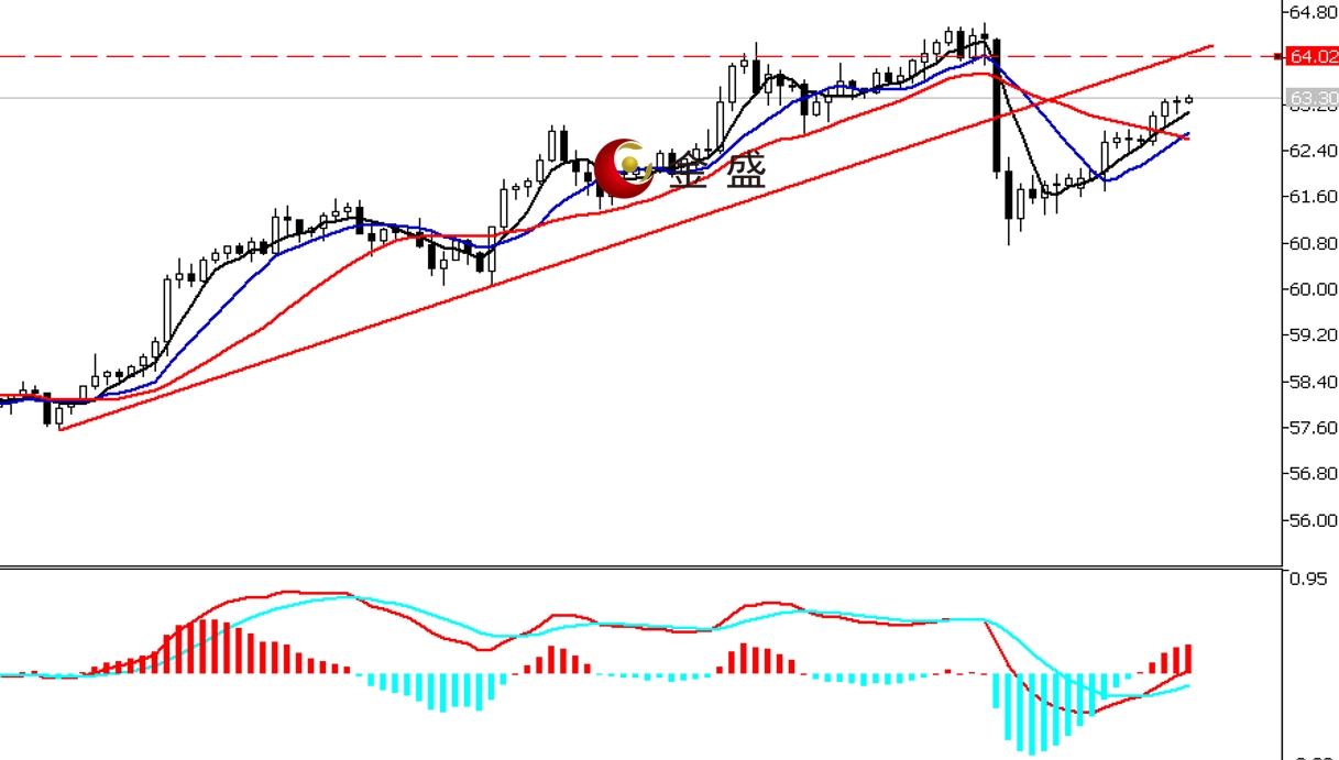 前一个交易日,白银走势与黄金类似,行情大部分时间是延续涨势,价格刷新历史新高至64.6美元一带,尾盘一小时下挫逾两美金,最终收阴线。今天白盘行情持续反弹至63美元上方,多头收复上周五大部分跌幅。四小时周期,均线系统拐头向上,对价格构成支撑。MACD指标快慢线零轴下方现金叉,做多的动能为主。白银强势上涨格局不变,但64美元上方出现两次承压,且价格跌破图示的加速上涨支撑线,短期多头力度减缓。行情偏向高位休整,操作上高抛低吸。