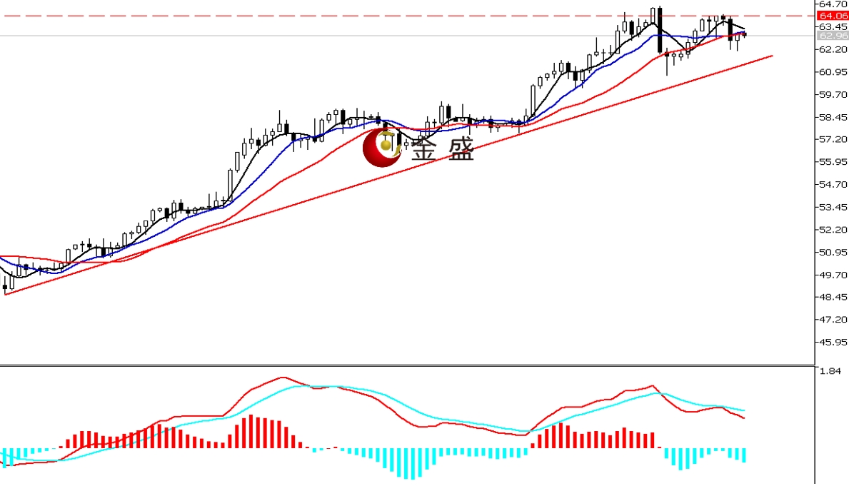 前一个交易日,金银走势出现分化,白银表现偏强,价格持续反扑至64美元关口,当日涨幅逾3%。今天白盘行情未延续涨势,而是跟随金价调整,盘中回踩62美元附近有反抽。四小时周期,均线系统不断收敛,价格围绕其震荡。MACD指标快慢线零轴上方现死叉,做空的动能为主,指标确认顶背离。白银强势上涨格局不变,价格运行在图示的趋势线之上,但64美元关口形成强压力区,短期多头力度减缓。行情偏向高位休整,操作上高抛低吸。
