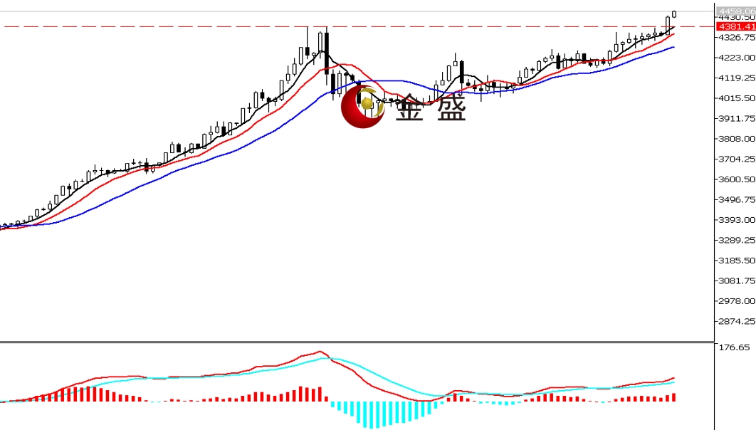 前一个交易日,早盘时段,黄金开市即创当日低点4337.9美元,随后在小时图一波八连阳冲上4400美元大关。欧盘短暂窄幅休整。晚盘时段,行情涨势延续,但力度有所放缓,价格创当日高点4435.37美元,日图收饱满大阳线。均线系统逐渐向上拐头,运行在价格下方形成支撑。MACD指标快慢线零轴上方运行,做多的动能增强。黄金日图形成U型突破,上行空间打开。今天早盘价格继续拉升,下一个压力参考4500美元附近,操作上调整做多为主。