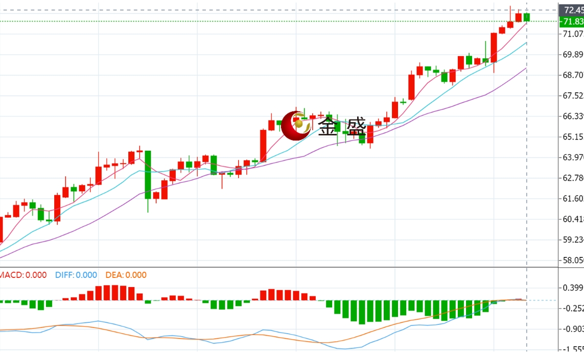 前一个交易日,白银走势与黄金同步,行情持续上涨再创历史新高,价格突破70美元的关键心理关口收阳。今天早盘价格在下一城突破72美元大关,午后强势横盘休整。四小时周期,均线系统多头排列,对价格构成支撑。MACD指标快慢线零轴上方现金叉,做多的动能为主。白银强势上涨格局不变,高点形成的压力线被强势突破,操作上做多为主。