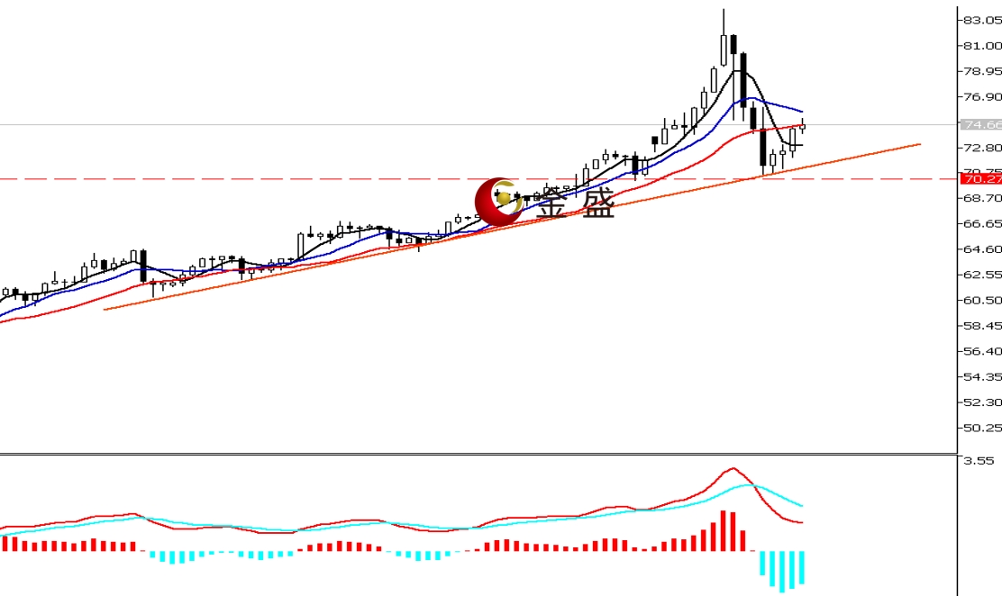 前一个交易日,白银冲高跳水,盘中跌幅一度扩大至10%,价格下行逼近70美元关口,最终收大阴线。今天白盘行情震荡偏反弹,多头收复昨日部分跌幅。四小时周期,均线系统收敛向下拐头,布林带中轨压制价格反扑。MACD指标快慢线零轴上方现死叉,做空的动能为主。白银暴涨暴跌,走势形成尖顶结构,价格回落至图示的趋势线一带,短期关注70美元一带的支撑。行情或进入高位的盘整,操作上高抛低吸。