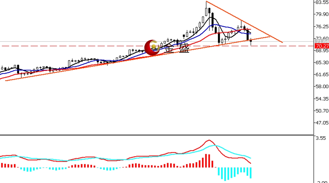 前一个交易日,白银表现偏强,价格持续反弹至78美元一带,多头收复周一一半的跌幅,最终收涨逾5%。今天白盘受消息影响,金价再度跳水,白银跟随下挫,但价格未跌破周一低点。四小时周期,均线系统收敛向下拐头,布林带中轨压制价格反扑。MACD指标快慢线零轴上方现死叉,做空的动能为主。白银回吐昨日全部涨幅,再次形成倒V字型结构。价格刺破图示的上涨趋势线,70美元一带是多空分水岭。一旦跌破,则确认进入下行趋势,操作上反弹做空为主。