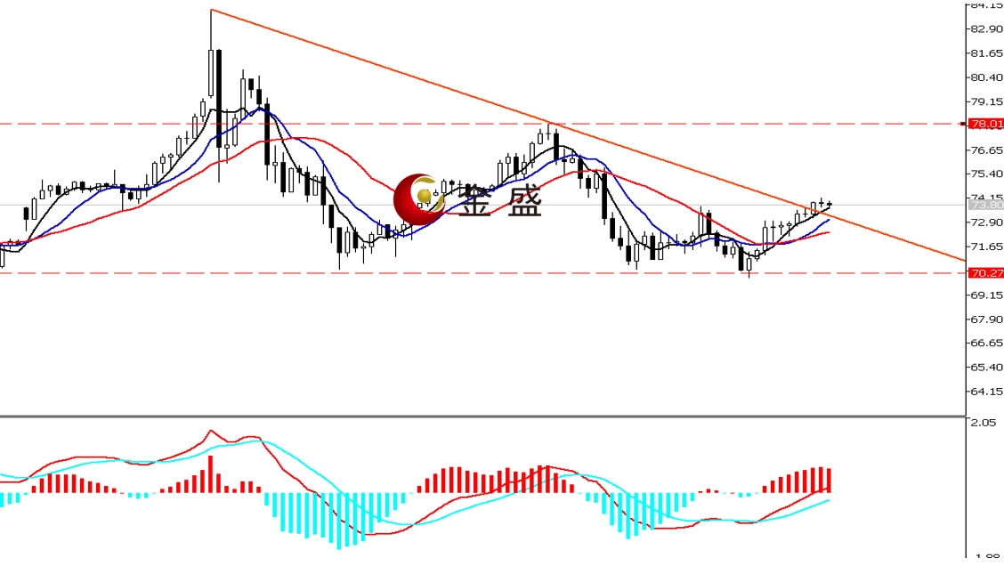 前一个交易日,白银走势与黄金类似,行情震荡下行至70美元关口,盘中跌幅一度超7%。今天白盘行情延续反扑,开市一小时拉升近两美金,午后日内涨幅逾3%。小时周期,均线系统收敛向上拐头,对价格上行构成支撑。MACD指标快慢线零轴下方金叉,做多的动能为主。白银盘口波动较大,但行情在小时周期还未形成明显的下行趋势,走势属于大跌后的盘整。70美元一带是多空分水岭。短期黄金下行受阻,白银或进入区间休整,操作上高抛低吸。