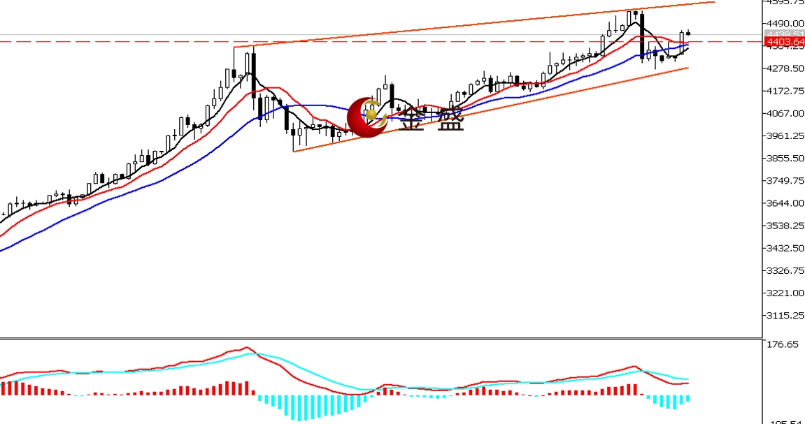 前一个交易日,早盘时段,受避险情绪提振,黄金高开高走单边上涨,价格快速突破4400美元大关口。晚盘时段,美国经济数据不及预期,行情延续上行继续扩大日内涨幅,价格最高至4455.39美元,日图收饱满中大阳线。均线系统不断收敛,运行在价格下方形成支撑。MACD指标快慢线零轴上方现死叉,做空的动能减弱。行情向上突破上周的盘整结构,4400美元一带形成支撑位,后市偏向测试4500美元上方的压力。行情或形成图示的楔形结构,操作上调整做多为主。