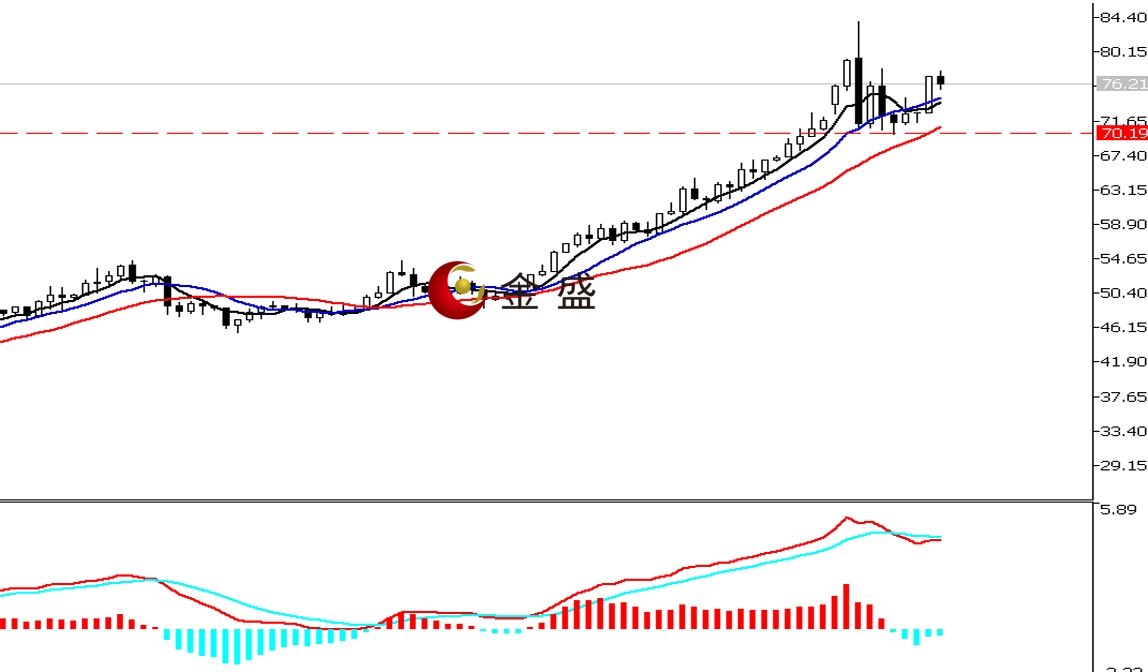 前一个交易日,白盘时段,银价开市即创当日低点72.62美元,随后连续中阳线突破多个关口。午盘围绕76美元一带震荡。晚盘时段,白银继续上涨突破77美元关口,当日涨幅逾5%,最终收中大阳K。均线系统多头排列,运行在价格下方形成支撑。MACD指标快慢线零轴上方现死叉,做空的动能为主。白银上行趋势不变,日图出现反转信号。近期价格震荡阴阳K线交替出现,行情形成70—78的震荡区间。昨日持续大涨收阳,价格来到区间上轨一带,短期关注区间真假突破。