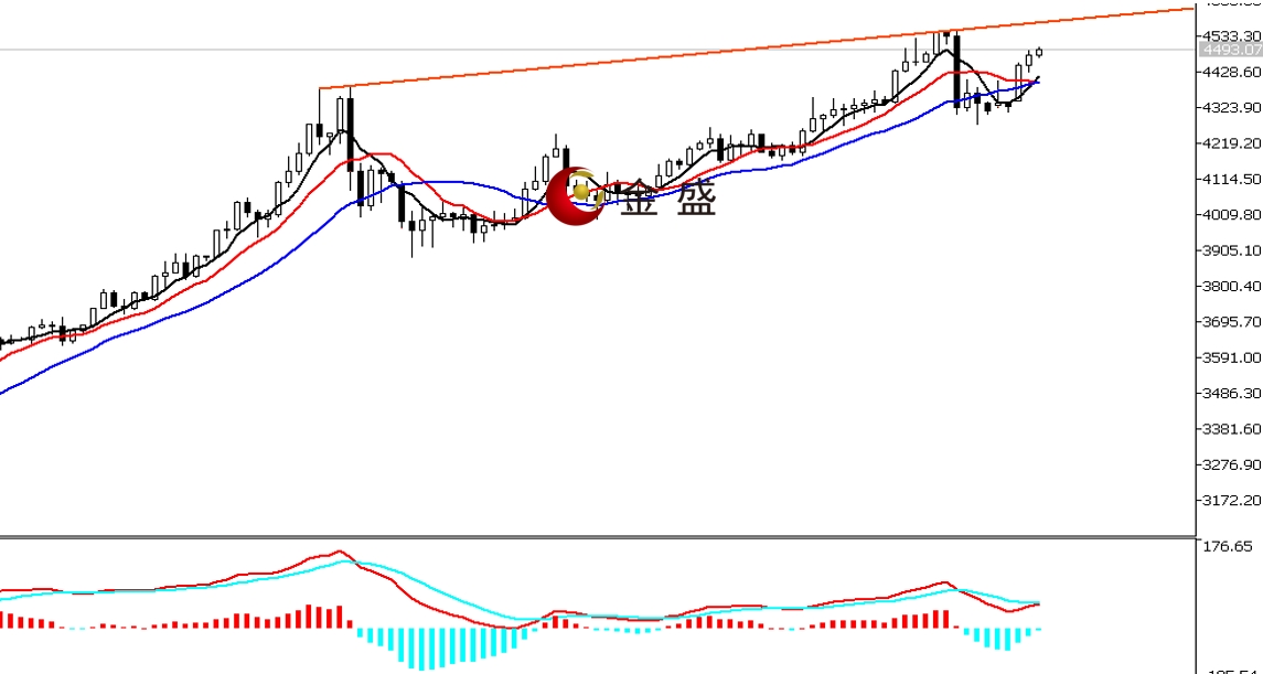 前一个交易日,早盘时段,黄金围绕二十美金的空间横盘数小时,价格创当日低点4428.02美元后拐头上行,午盘行情承压4480美元一带有所调整。晚盘时段,行情延续涨势,价格冲上4490美元一带,日图再收阳线。均线系统不断收敛,运行在价格下方形成支撑。MACD指标快慢线零轴上方走平,做空的动能减弱。黄金连续两日上涨,价格来到4500美元一带。周一是单边大涨,昨日是平台式稳步上行,盘中回调幅度很小,可见市场做多意愿很强。操作上调整做多为主。