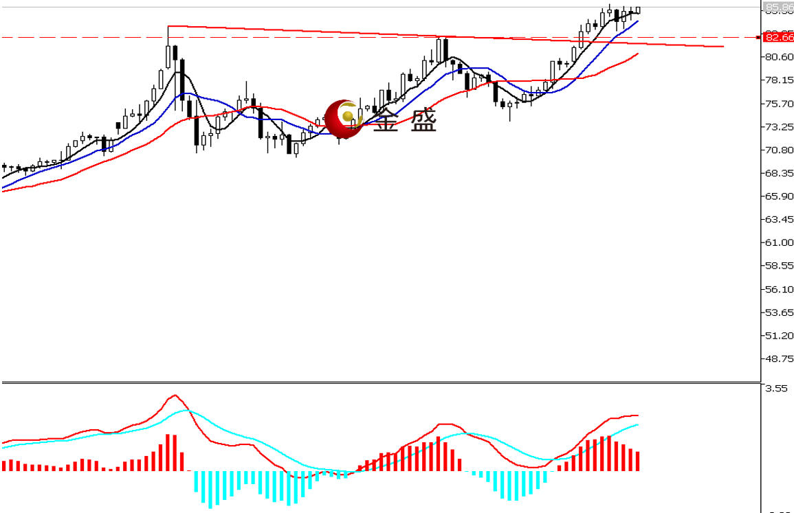 前一个交易日,白银走势与黄金同步,价格持续走高突破多个关口,盘中一度站上86美元大关,日图收涨逾6%。今天日内行情先跌后涨走V字型,多头维持强势格局。四小时周期,均线系统多头排列,运行在价格下方形成支撑。MACD指标快慢线零轴上方金叉,做多的动能减弱。白银上行趋势不变,走势向上突破收敛三角形。今天早盘芝商所宣布将再次上调保证金,白银小幅调整后V字型,价格不跌反涨,可见多头看涨情绪依然浓厚,短期关注前高的真假破位。