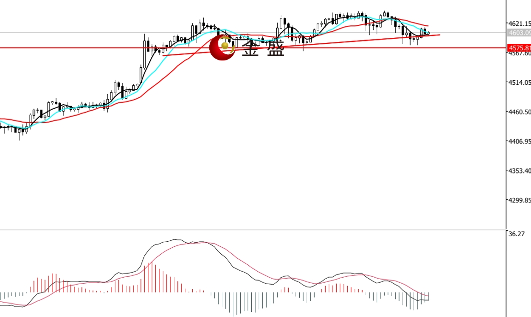 前一个交易日,美国零售数据超预期,美指围绕99美元关口震荡收阴线。黄金延续高位休整,但价格相对周二的K线穿头破脚,最终收十字星,多空进入僵持状态。今天日内行情继续区间震荡,但价格重心有所下移。小时周期,均线系统不断收敛,布林带中轨对价格反弹构成阻碍。MACD指标快慢线零轴上方现死叉,做空的动能为主。黄金上行趋势不变,短期进入4575-4640区间盘整。箱体内震荡逾两日,价格低点形成图示的支撑线,高位震荡依然偏强。早盘价格回踩区间下轨有反扑,操作上低吸为主。短期关注区间如何打破,向下破位,则关注4550美元附近的做多机会。