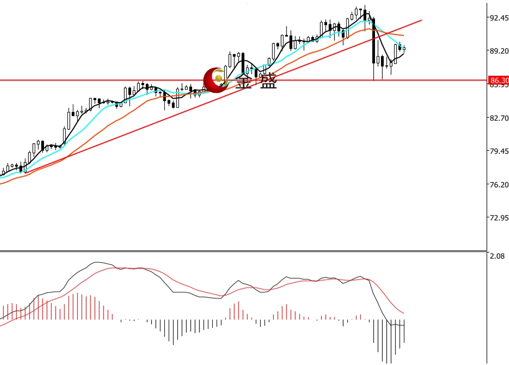 前一个交易日,白银涨势不减,价格继续大幅上行至90美元上方,当日涨幅逾6%,日图完成三连阳。今天早盘银价冲高至93美元附近转跌,盘口一小时下挫逾六美金,午后多头反扑收复部分跌幅。小时周期,均线系统不断收敛走平,价格围绕其震荡。MACD指标快慢线零轴上方现死叉,做空的动能为主。白银上行趋势不变,早盘出现跳水走势,价格跌破周内上行趋势线,多头回吐周内一半涨幅,空头力度相比之前有所增强,日内反扑一直受阻90美元关口,短期盘面或进入区间休整,操作上低吸为主。