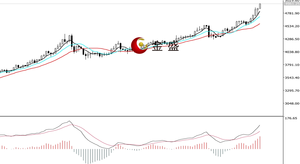 前一个交易日,市场避险情绪降温,金价凌晨大幅下挫至当日低点4755.71美元。亚盘行情有所反抽,价格重新站上4800美元关口,午后窄幅横盘整理。晚盘时段,黄金持续拉升,价格重回周三高点附近,日图收长下影线的阳线。均线系统多头排列,运行在价格下方形成支撑。MACD指标快慢线零轴上方现金叉,做多的动能为主。黄金上行趋势不变,今天凌晨突破4900美元大关,日图连续多日收阳,后市留意5000美元一带的压力反应,操作上低吸为主。