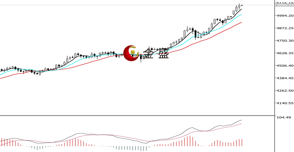 前一个交易日,地缘风险助力贵金属,黄金继续上行逼近五千关口。周末特朗普加强对伊施压力度,紧张局势令避险情绪升温。黄金日内高开高走,盘中接连打破多个关口,当日涨幅逾2%,午后围绕5100美元一带横盘整理。四小时周期,均线系统多头排列,运行在价格下方形成支撑。MACD指标快慢线零轴上方现金叉,做多的动能为主。黄金上行趋势不变,五千关口以跳空的方式突破,上行空间再度打开。日内价格拉升逾一百美金,但盘中无明显调整,K线也无承压信号,可见多头情绪强烈,操作上做多为主。