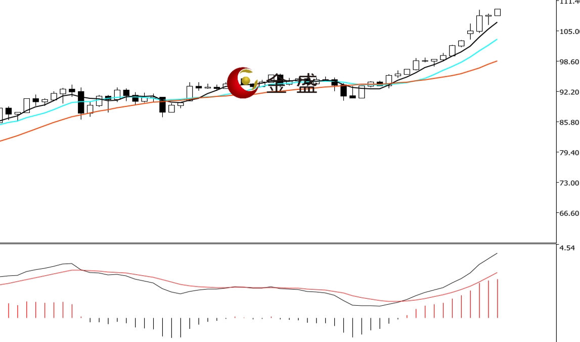 前一个交易日,白银继续上演疯狂走势,价格史上首次突破百元大关,当日收涨逾7%。今天日内涨势不止,价格高开高走至110美元一带,日内再涨逾6%。四小时周期,均线系统多头排列,对价格上行构成支撑。MACD指标快慢线零轴上方现金叉,做多的动能增强。白银上行趋势不变,价格持续加速上行。强势上涨不言顶,操作上不宜博空,做多为主。