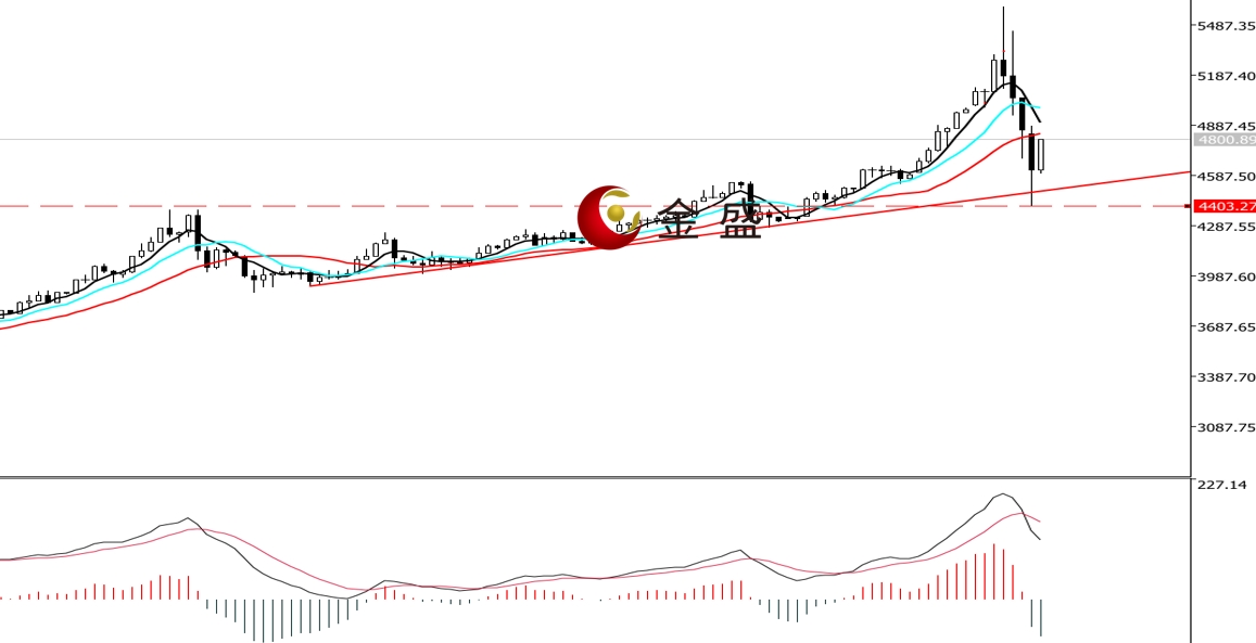 前一个交易日,早盘时段,受CME提高保证金的影响,黄金低开低走,盘中短暂回补缺口,创当日高点4884.11美元,随后单边下挫至4400美元一带。午盘行情有所反抽,收复部分跌幅。晚盘时段,市场波动性下降,多头受制于4800美元一带宽幅整理,最终收长下影线的阴线。均线系统不断收敛,运行在价格上方形成阻碍。MACD指标快慢线零轴上方现死叉,做空的动能增强。黄金上行趋势不变,价格走势形成图示的趋势线。昨日回踩支撑线出现反扑,确认其依然有效。行情经过暴涨暴跌之后,短期偏向进入高位休整,操作上高抛低吸。
