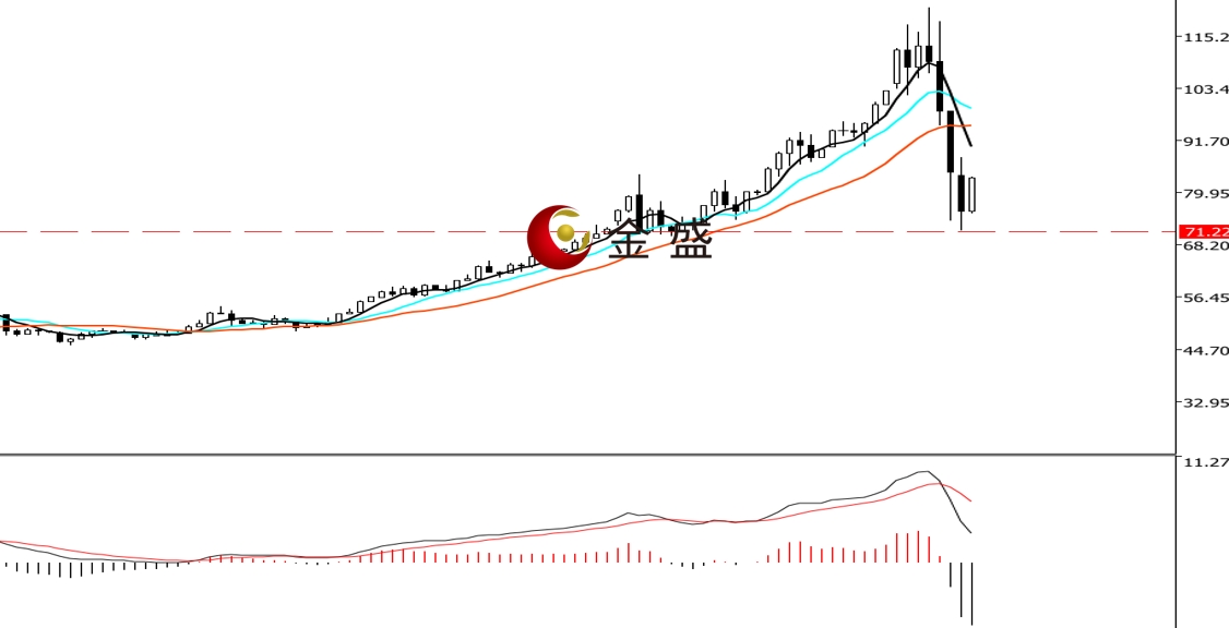 前一个交易日,亚盘时段,白银短暂休整,价格创当日高点87.78美元。随后跟随黄金下挫,但跌势相对减缓,价格最低至71.35美元。午盘多头反扑收复当日大部分跌幅。晚盘时段,恐慌情绪有所缓和,多空围绕80美元关口争夺,最终收阴线。均线系统不断收敛,价格跌破其支撑。MACD指标快慢线零轴上方现死叉,做空的动能为主。白银价格回踩前一波暴涨的起点70美元附近。近期走势形成尖顶结构,白银上行的逻辑不变,但当前空头力度强劲。行情或进入高位的震荡,操作上高抛低吸。