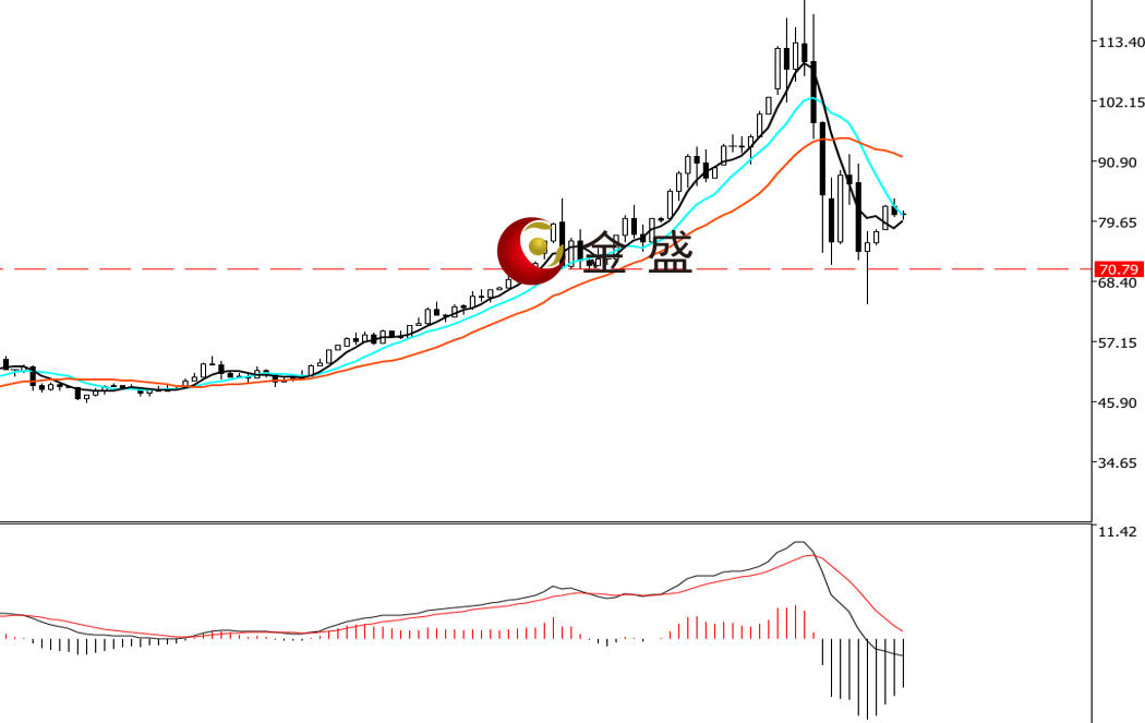 前一个交易日,白盘时段,银价承压84美元关口震荡下行,亚盘一小时跌破多个整数关口,午后围绕81美元一带横盘休整。晚盘时段,行情向下打破区间,创当日低点80.44美元,日图收阴线。均线系统不断收敛,价格围绕短期均线震荡。MACD指标快慢线零轴上方现死叉,做空的动能为主。白银形成倒V字型走势,行情反扑两日后进入区间震荡,盘中调整不大,下方强支撑关注80美元一带的得失。操作上高抛低吸。