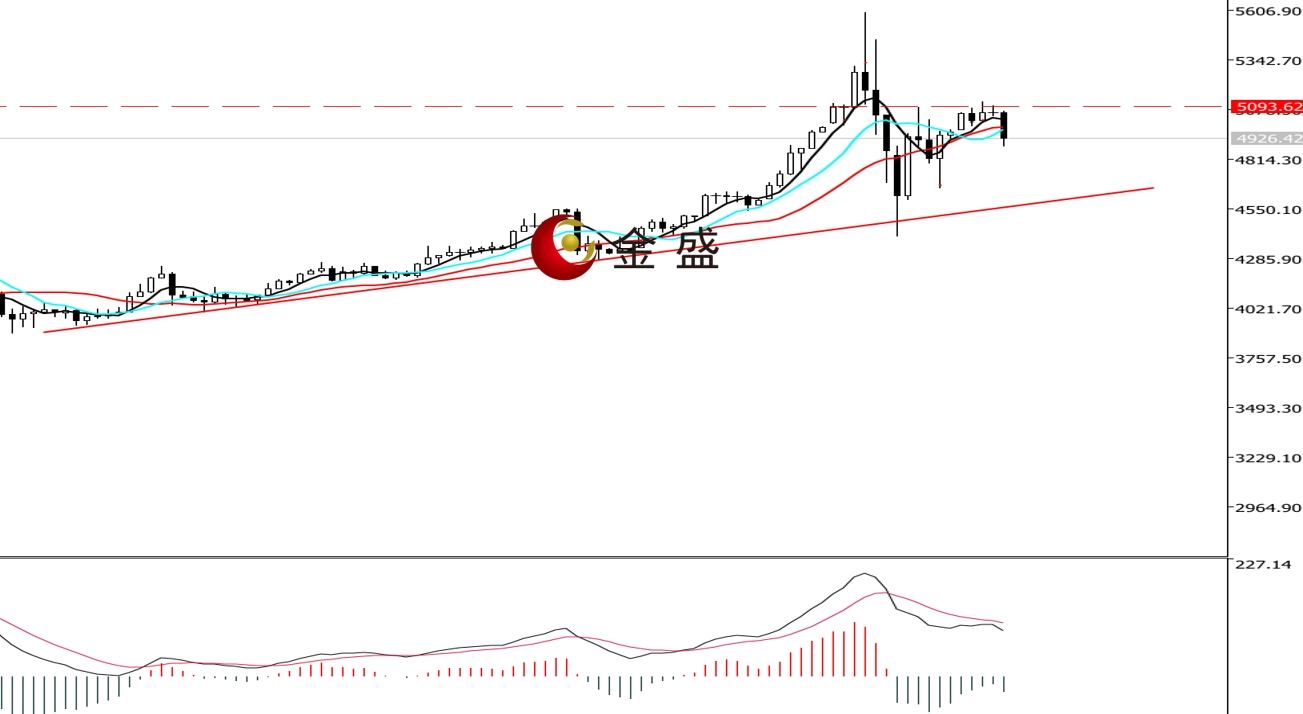 前一个交易日,早盘时段,黄金承压5100美元关口徘徊数小时,亚盘一小时下挫逾四十美金。午后行情围绕三十美金的空间震荡,晚盘市场延续牛皮市走势,价格创当日低点5039.4美元,日图收十字星。均线系统不断收敛,价格跌破其支撑。MACD指标快慢线零轴上方现死叉,做空的动能为主。黄金上行趋势不变,行情进入高位的休整。今天凌晨出现大幅下挫,盘中一度跌破4900美元大关。行情周内休整两天选择向下变盘,5100美元关口再度承压,短期偏向震荡下行,操作上高抛低吸。