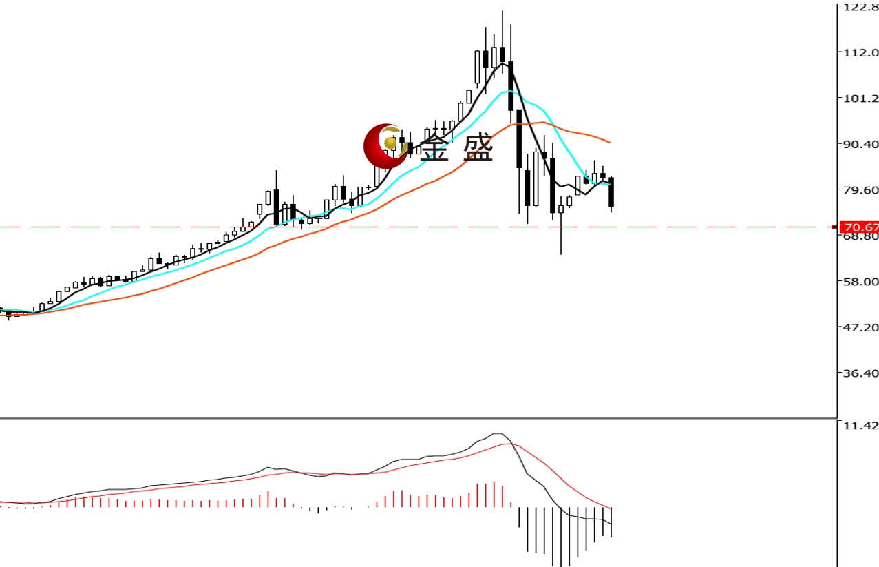 前一个交易日,白盘时段,银价承压85美元一带震荡下行,早盘回踩小时图趋势线,创当日低点81.53美元。午后围绕83美元关口横盘整理。晚盘时段,行情延续区间休整,但价格重心有下移,最终收阴线。均线系统不断收敛,运行在价格上方形成压力。MACD指标快慢线零轴上方现死叉,做空的动能为主。白银今天凌晨跌破高位休整结构,多头失守80美元关口加速走低,确认第二波反弹结束,短期关注70美元一带的得失,操作上高抛低吸。