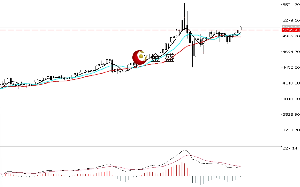 前一个交易日,白盘时段,黄金围绕五千关口徘徊,价格创当日低点4975.2美元,午后突破区间震荡上行。晚盘时段,美国经济数据不及预期,黄金延续上涨,盘中短暂调整刺破五千大关,随后拉升至5100美元一带,日图收饱满阳线。均线系统收敛向上拐头,对价格上行构成支撑。MACD指标快慢线零轴上方运行,做空的动能减弱。黄金上行趋势不变,行情进入高位的休整。随着美伊局势恶化,今天早盘价格冲上5100美元大关,短期关注此关口的真假突破,操作上调整做多为主。