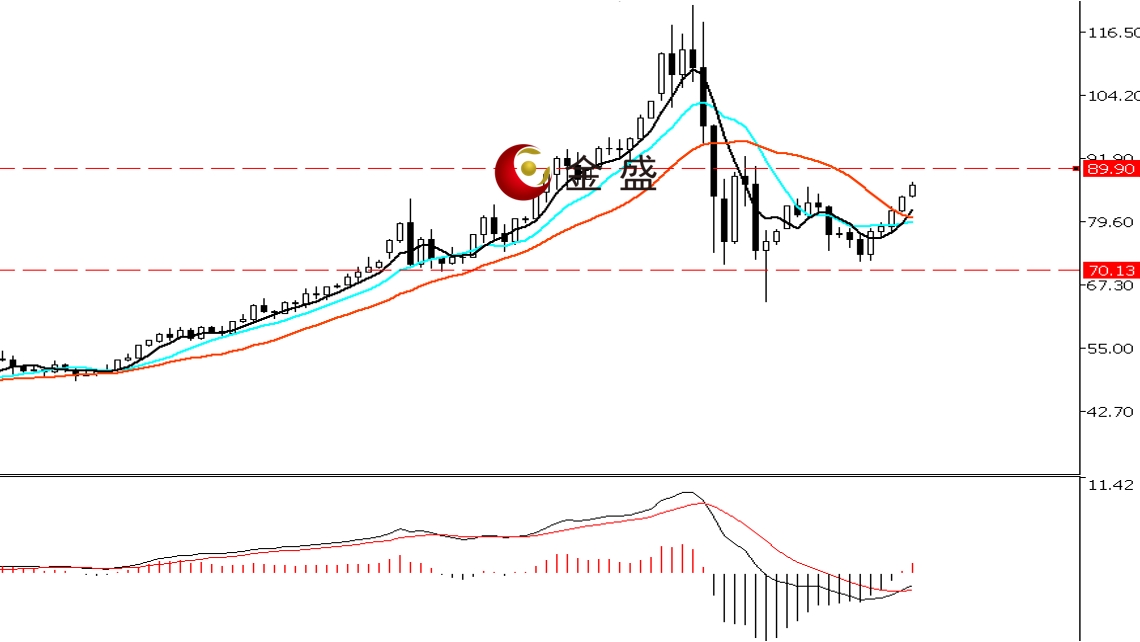 前一个交易日,白盘时段,银价区间盘整,价格创当日低点77.32美元,午后持续上行突破80美元关口。晚盘时段,基本面利多贵金属,白银连阳加速上行,创日内高点84.57美元,日图再收阳线。均线系统不断收敛,运行在价格下方形成支撑。MACD指标快慢线零轴附近现金叉,做多的动能增强。白银周线形成阳包阴结构,日图连阳反弹。行情继续高位的休整,价格运行在图示的70—90区间内,短期关注结构上轨一带的真假突破,操作上高抛低吸。