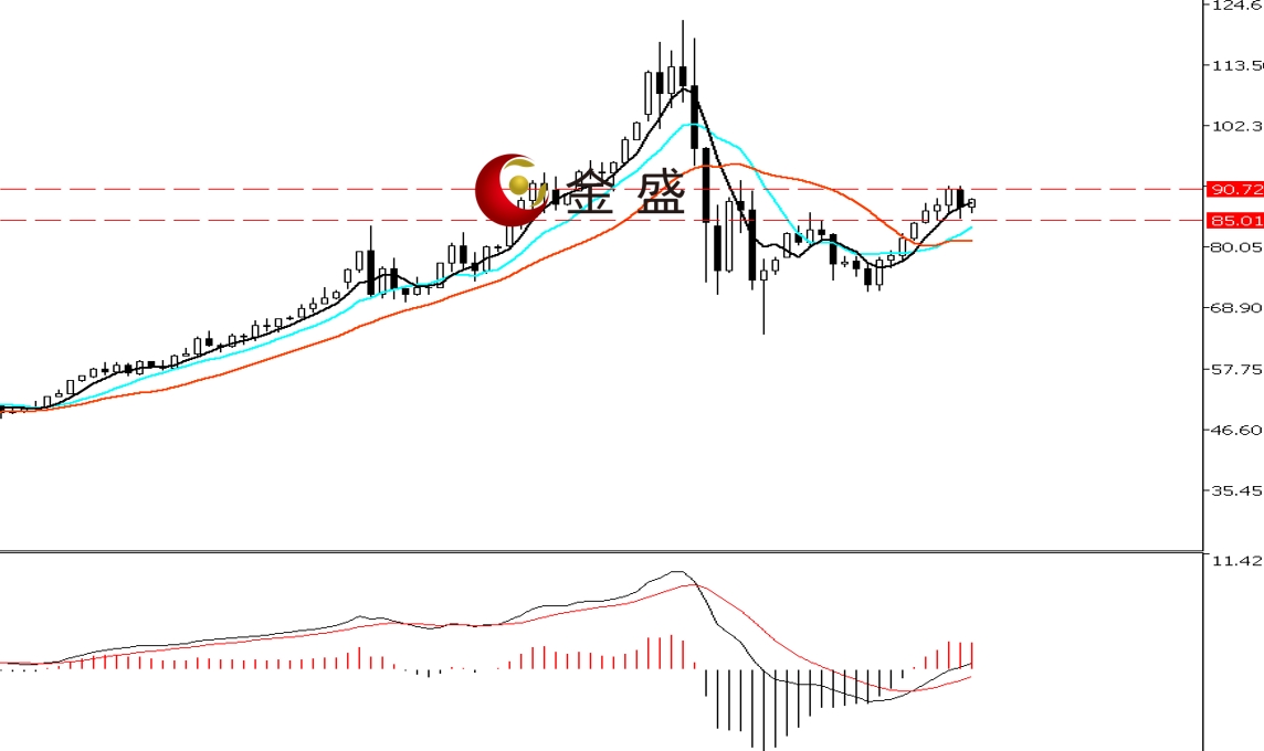 前一个交易日,白银围绕90美元一带横盘数小时,价格创当日高点91.26美元,随后跳水打破区间震荡走低。晚盘时段,行情探底回升,价格最低至85.22美元,盘中一小时拉升逾两美金,最终收阴线。均线系统收敛向上拐头,运行在价格下方构成支撑。MACD指标快慢线零轴附近现金叉,做多的动能增强。白银运行在箱体结构内,昨日在形态上轨调整,形成阴包阳结构,强化90美元上方的压力。此关口不能有效突破,则偏向震荡回落。