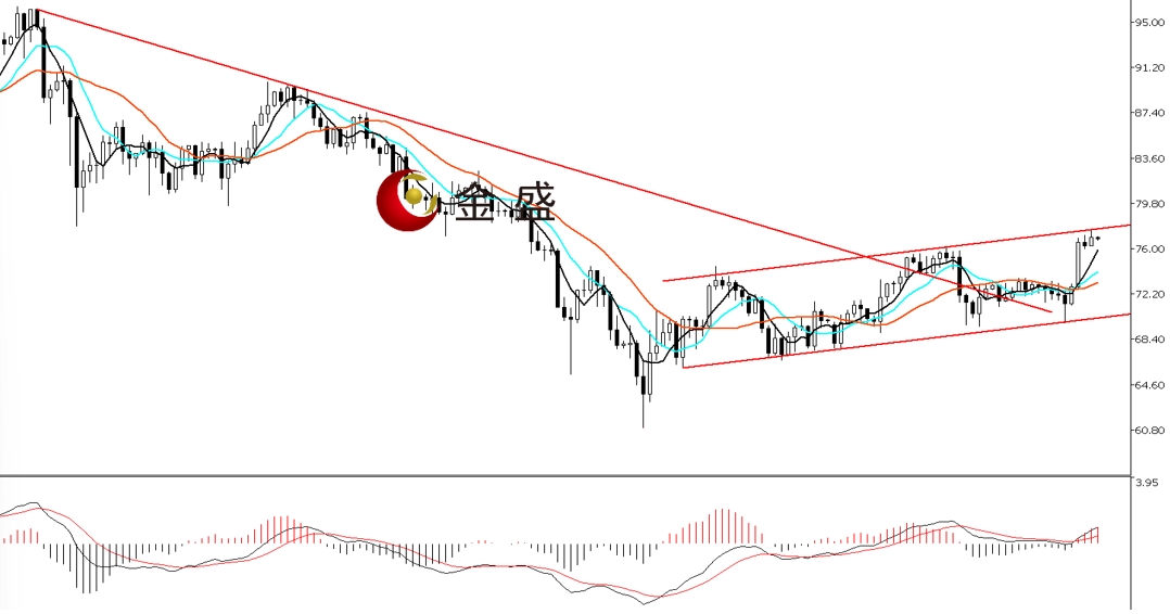 前一个交易日,美伊局势反转前,白银承压73美元一带横盘数小时,晚盘拐头下行一度失守70美元大关。今天凌晨随着双方在释放停火意愿,白银震荡上行为主,早盘加速拉升,一小时走高三美金。四小时周期,均线系统收敛向上拐头,运行在价格下方形成支撑。MACD指标快慢线零轴上方现金叉,做多的动能增强。白银突破图示下行趋势线,价格站上75美元关口,即突破U型底结构。K线高低点维持同步上移,形成图示的上行通道,短期关注通道上轨的真假突破,操作上低吸为主。